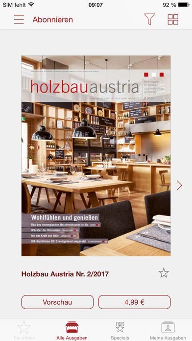 App Storeより引用holzbau austria ist ein deutschsprachiges Fachmagazin für Holzbau und nachhaltige Architektur. Das Medium bildet 8x jährlich die international besten Gebäude aus Holz ab, die nach hohen ökologischen Standards erbaut wurden. Experteninterviews und tiefgehende Hintergrundinformationen unterstützen den fachlichen Ansatz, das Bauen mit Holz von der Konzeption über die Planung bis hin zum Bau und Innenausbau sowie der energetischen Betrachtung umfassend zu vermitteln.