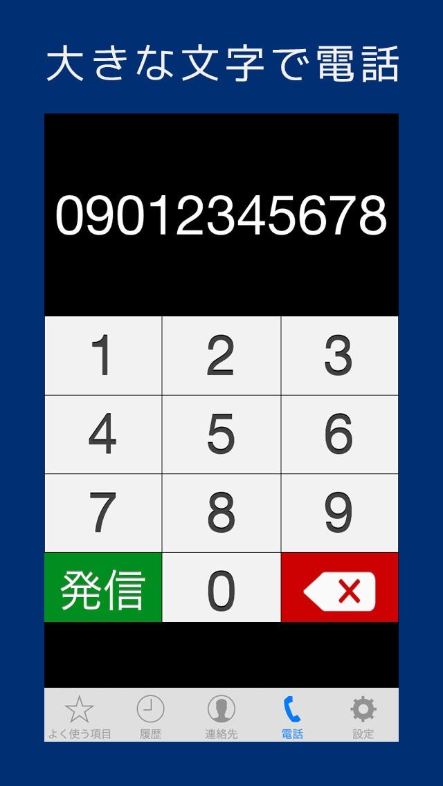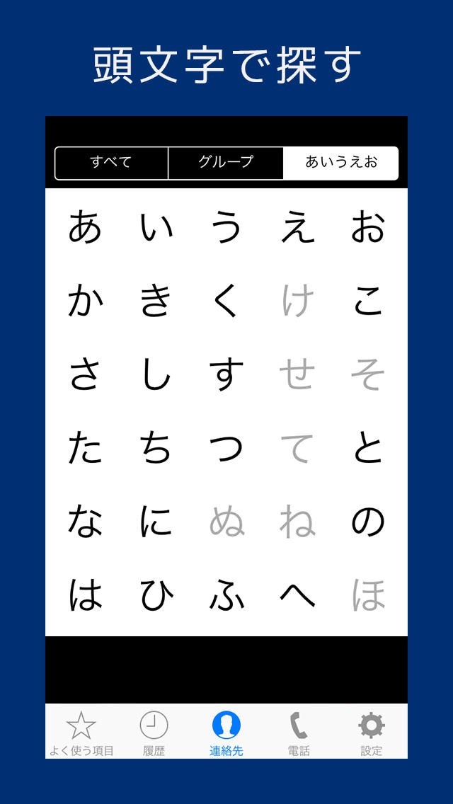 大きな文字で見やすい電話帳 - 大きな連絡先は電話帳・連絡先アプリで、その名の通りスマートフォンの画面に同時に三件ほどの連絡先の見出しが表示されるため非常に大きな文字で見やすくなっており、さらに文字サイズは3種類から設定することが出来ます。標準の連絡先アプリから取り込みが可能で頻繁に使う連絡先はタップのみで発信できる機能もあり、グループ分けの機能によって連絡先を整理したり、連絡先を頭文字で検索するなどの機能もあります。