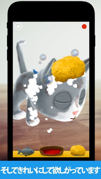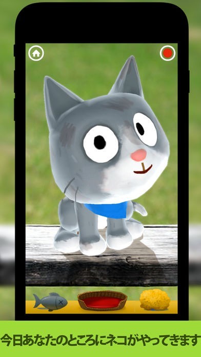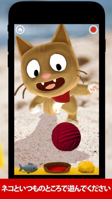 iPhone または iPad のカメラを部屋のお好きな場所に向けてください。使用している機器を動かないまま固定してください。画面上の黄色い円が白に変わったら、それをタッチしてください。はらはらする瞬間がやってきました:かわいい子ネコが画面上に現れ、あなたと一緒に遊ぶのを待っています。