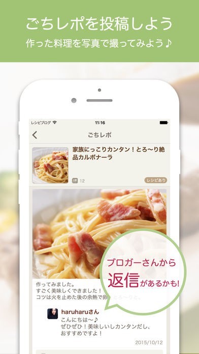 レシピに対して感想コメントを残したり、アプリを利用しているメンバー同士交流を楽しむことができる機能がついています。自分の作ったレシピを掲載することも可能なので、自慢の一品を掲載してみましょう。