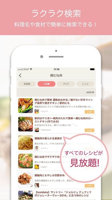 任期ブロガー16,000人のレシピを見ることができ、100万品以上のアイディアレシピが掲載されているアプリです。お気に入りのブロガーさんを登録しておけば、最新情報が自動的に届きます。また、カテゴリ別に掲載されているので見やすいです。1番人気のレシピもすぐわかります。検索機能で食材や料理名を入れるだけでお料理の参考になるレシピ一覧が並びます。ブロガーさんからの返事もあるので、コメントを残してみましょう!