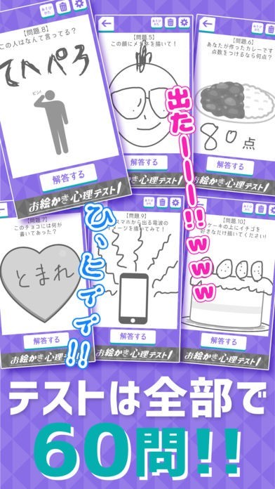 60問のお題の中から出題された内容に沿って、自分の思った絵を描いてください。完成した絵によって、その人の心理を当てるゲームとなっております。ちょっと恥ずかしい内容もあったりするので、仲の良い人とやるのがオススメです。