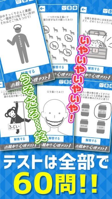 「お絵かき心理テスト7」はスマホ画面にお題に従い絵を描くだけで、心理テストができるアプリです。「社交的か内向的か?」、「地球を救うときにあなたはこうする!」といった問いに対する答えがわかる、今人気のアプリです。