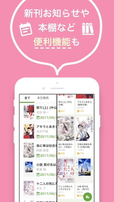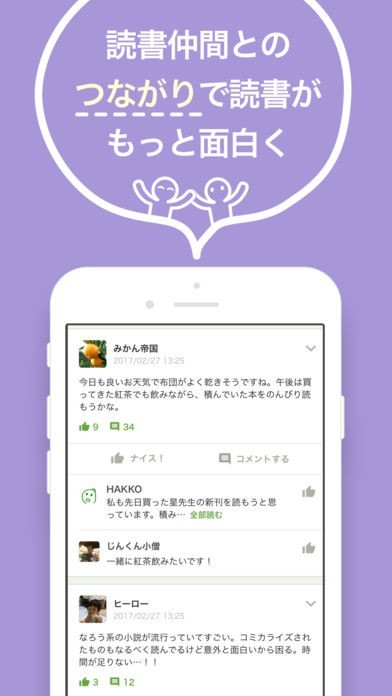 同じ本を読んだ人のレビューや感想をすぐに確認することができます。また、読書仲間が集まるコミュニティーやイベントの情報、新刊のお知らせも掲載しています。自分と同じ趣味の人と交流すしたい人にオススメの機能です。