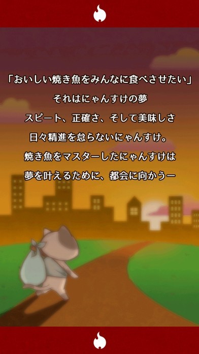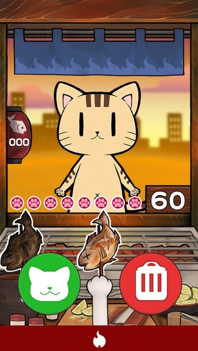 猫が屋台の店で猫のお客さんにおいしい焼き魚を提供するゲームです。焼き場に次々と魚が流れてきます。魚にはうまく焼けている魚、焦げて真っ黒になっている魚、焼けていない生の魚があります。うまく焼けている魚は緑のボタンをタップしてお客さんの元へ、うまく焼けていない魚は赤いボタンをタップして廃棄します。 正しくボタンを押すとミャオポイントが上がり、ボタンを押し間違えるとお客さんが怒ってミャオポイントが下がりタイムも減ります。ミャオポイントが0になるとゲームオーバーです。たまに流れてくる金魚を提供することでタイムを増やせます。