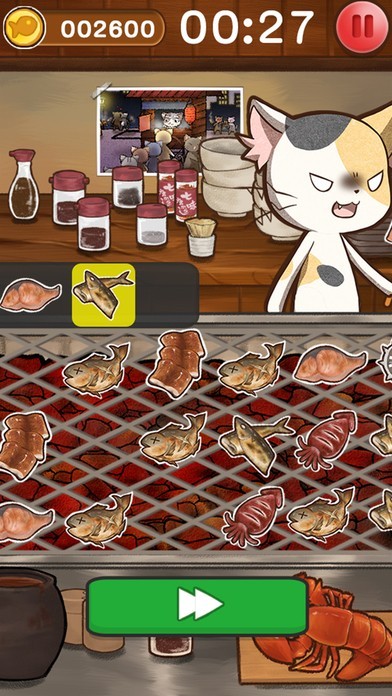 美味しく焼けたメニューをタップし、テンポよく料理を出そう!にゃんすけの愛くるしさが人気を博した「焼き魚屋台ゲーム」の続編