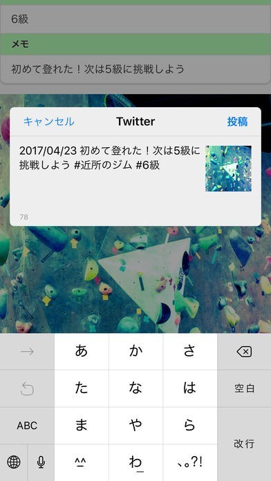App Storeより引用スポーツクライミングでトライした課題をメモして記録に残したり、課題の研究に利用できるアプリです。twitter、facebookへの投稿もできます。(facebookは場所と写真のみシェアする内容として設定されます)