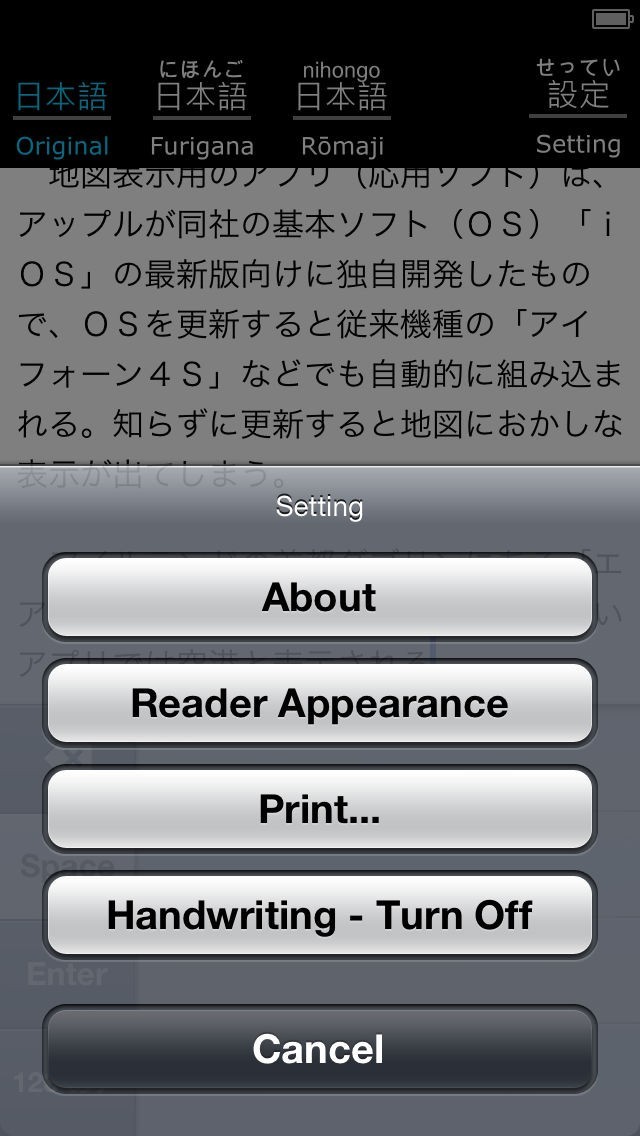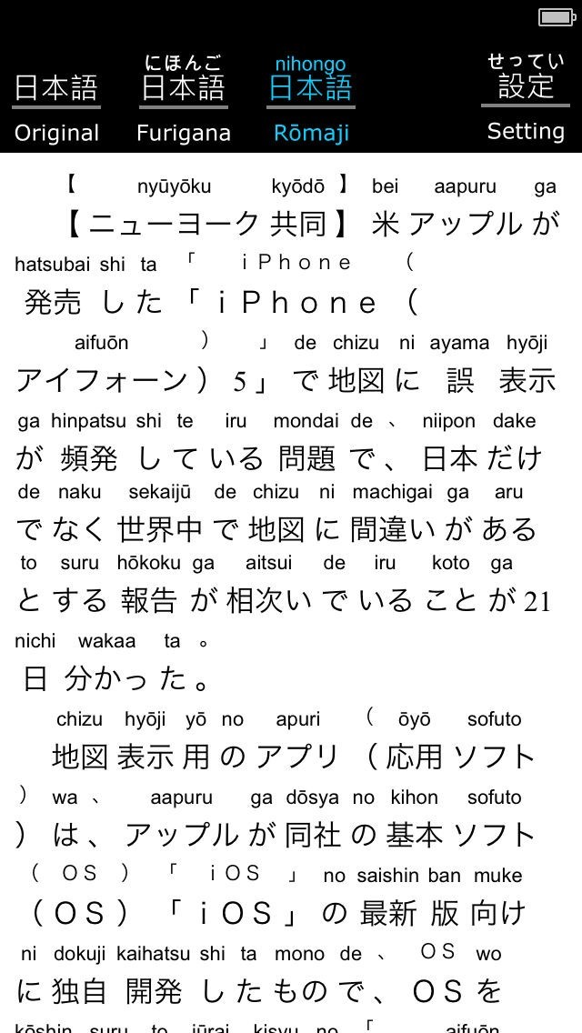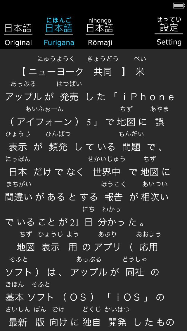 漢字込みの文章も楽に読めるように!平仮名、ローマ字どちらでも振り仮名表示できます!