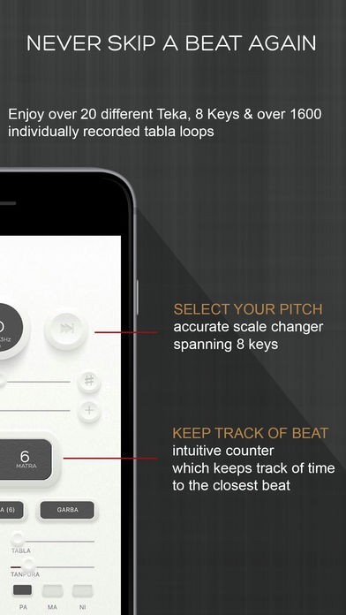 Tabla Studio boasts 24 different Teka, 8 Keys & over 1600 individually recorded tabla loops, all to benefit your riaz experience. Distinguishable to all Kalyan Studio Apps, Tabla studio has a user-friendly interface, which allows for easy maneuvering between a vast range of scales, tempo, genres and beat variations.