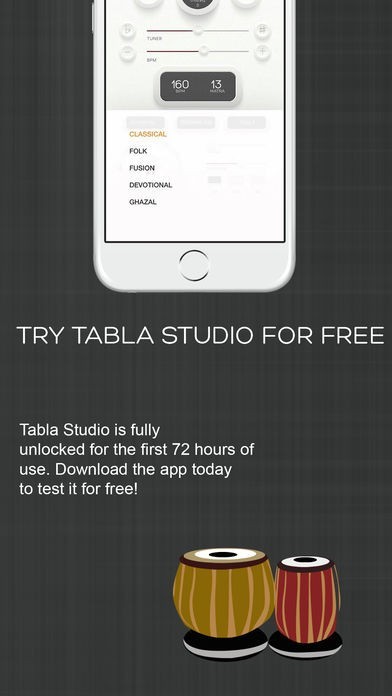 Please note: Tabla Studio is free to download and can be used, fully unlocked, for the first 72 hours. After 72 hours, the app would still work, however the audio would be interrupted after 60 seconds of continuous playing.