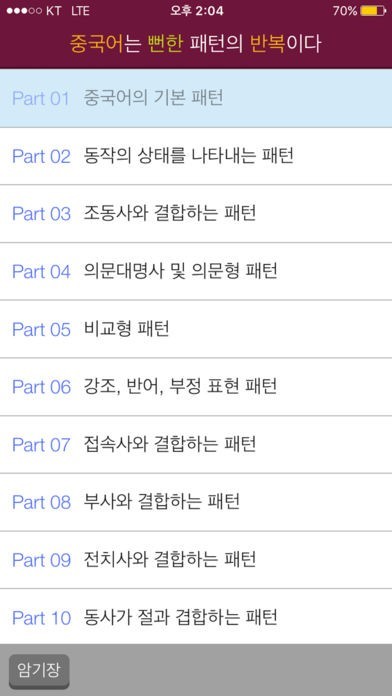 복잡한 건 딱 질색! 군더더기 없는 심플한 구성으로 체계적인 반복 학습을 절묘하게 살릴 수 있는 건 오직 패턴! 앱에 나온 그대로 따라가기만 하면 필요한 순간에 요긴하게 써먹을 중국어 문장들이 고민할 틈 없이 나와주는 패턴의 특장점! 결국 중국어는 뻔한 패턴의 반복이었음을 무릎 치며 확인하기까지 그리 오래 걸리지 않을 것입니다.