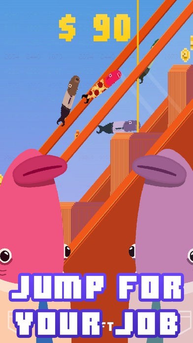 Employees must collect coins, avoid slippery staff, pick up power-ups and jump on profit lines, all while leaping from step to step!