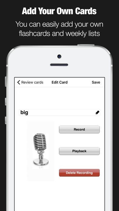• Add your own cards - you can add an unlimited number of new words and record your own voice