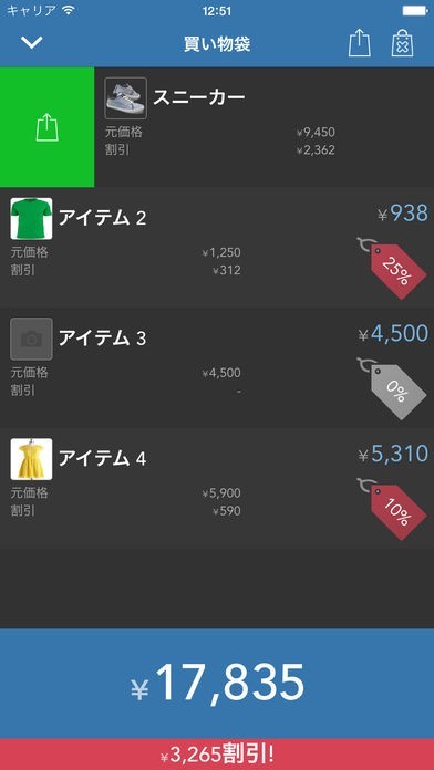 バーゲンで買った商品と値段を管理!割引計算もラクラク!