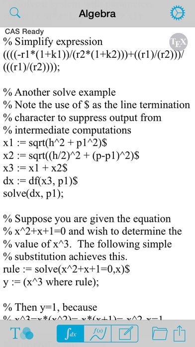 If you're not familiar with REDUCE, it is an extremely powerful and flexible computer algebra system with a track record spanning over 40 years of use in the engineering, computer science, and physics research community. Simply put, iCAS is like having Mathematica or the computational engine of Wolfram Alpha in your pocket but, best of all, it runs natively on your iOS device so no internet connection is required. iCAS is fully programmable and provides the ability to reuse previous results in computations.