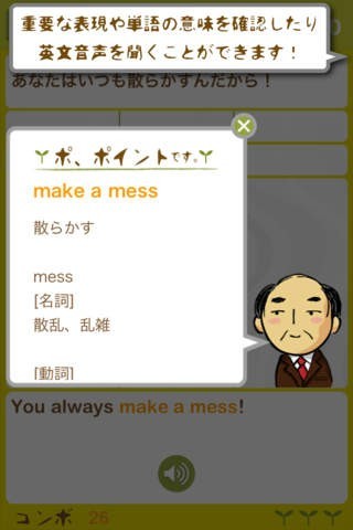 アプリで使われているセンテンスは日常英会話での慣用句やコロケーションを中心に厳選して収録しており、「生・英会話」(普段使える英会話)を学習できるようになっております。
