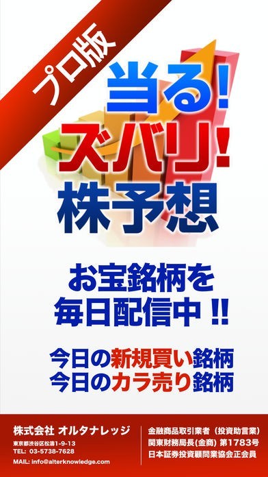 App Storeより引用ズバリ株予想【実戦版】投資顧問会社オルタナレッジが提供する銘柄推奨サービスです。【上がる株】【下がる株】を具体的にズバリ予想し、会員限定で日々公開します。