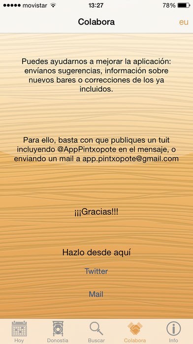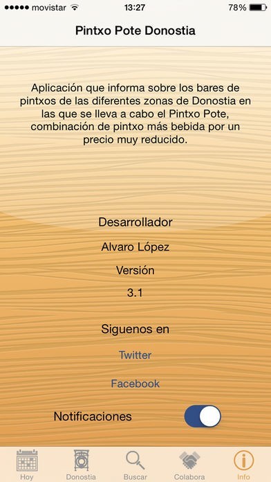 App Storeより引用Con esta aplicación puedes conocer los bares de los diferentes barrios de la ciudad de Donostia que hacen Pintxo Pote. Tendrás información actualizada de los bares y restaurantes indicando el día, la hora y el precio.