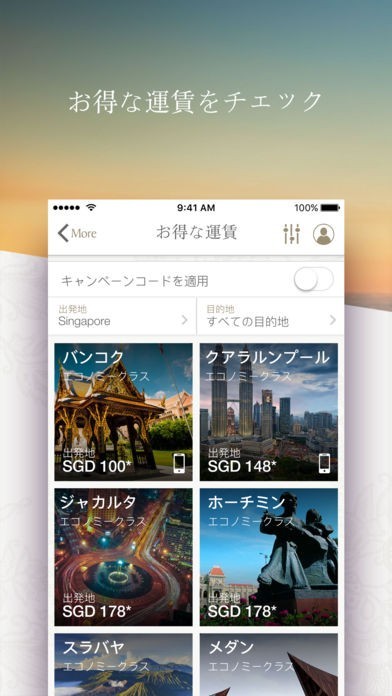 シンガポール航空のチケット予約からチェックインまで、アプリ一つで簡単に操作できます。お得なバーゲン価格のチケットも一覧で表示されているので探しやすいです。シンガポール航空を利用する回数が多い方には特に使いやすいアプリとなっています。