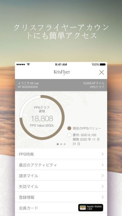 シンガポール航空が加盟するクリス裏イヤーのアカウントにアプリからアクセスすることができます。マイルの明細や獲得履歴をチェックしたり、最近のアクティビティや登録情報などチェックできます。マイルは航空チケット購入に利用できるのでとてもお得です。