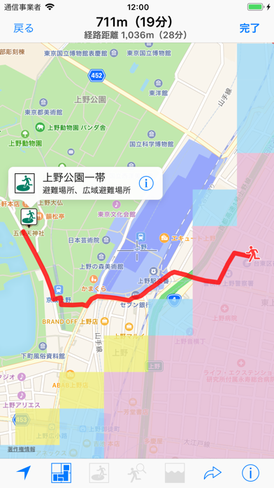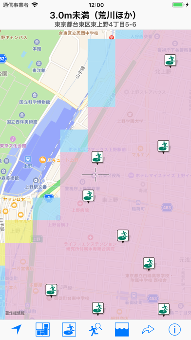 App Storeより引用関東(茨城県,栃木県,群馬県,埼玉県,千葉県,東京都,神奈川県)の浸水想定区域と日本全国の避難所約12万6千件を収録した洪水ハザードマップです。現在地または任意地点の想定最大浸水深と最近隣の避難所およびその避難経路を検索することができます。浸水想定区域および避難所はいずれも平成24年度作成のデータを収録しています。はじめての土地で現地のハザードマップを所持していないときや,災害対応の机上訓練などにご利用ください。なお,関西の浸水想定区域を閲覧されたい方は関西版,中国・四国の浸水想定区域を閲覧されたい方は中国・四国版,九州・沖縄の浸水想定区域を閲覧されたい方は九州・沖縄版ご利用ください。