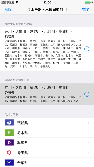 マップ画面表示する洪水予報・水位周知河川の想定浸水区域を選択できます。捜索範囲は1kmです。区域選択後に完了ボタンをタップすると,画面に浸水区域が表示されます。