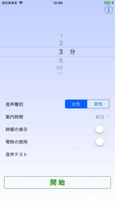 時刻を声で教えてくれる便利なアプリです。音声は男性もしくは女性の声を選択するだけで切り換えも簡単なので、誰でも簡単に使うことができます。時間間隔も自由に設定可能です。