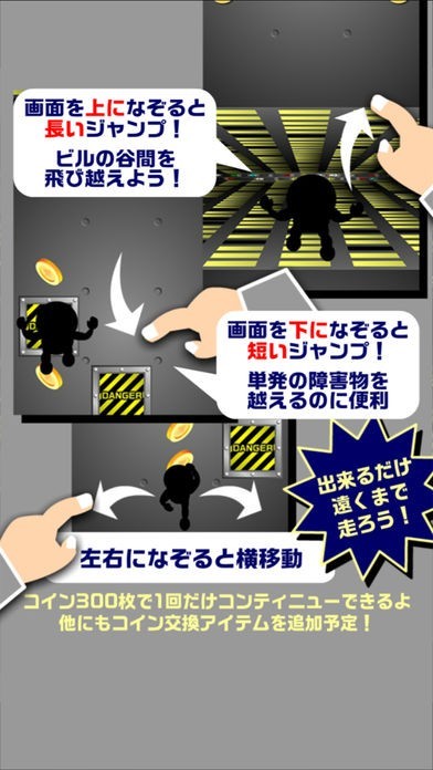 画面を上下になぞると、それぞれ大ジャンプと小ジャンプができます。同じように左右になぞると、左右の方向へと動きます。大ジャンプはビルからビルへ飛び移る際に使い、小ジャンプは障害物を避ける時に使用します。