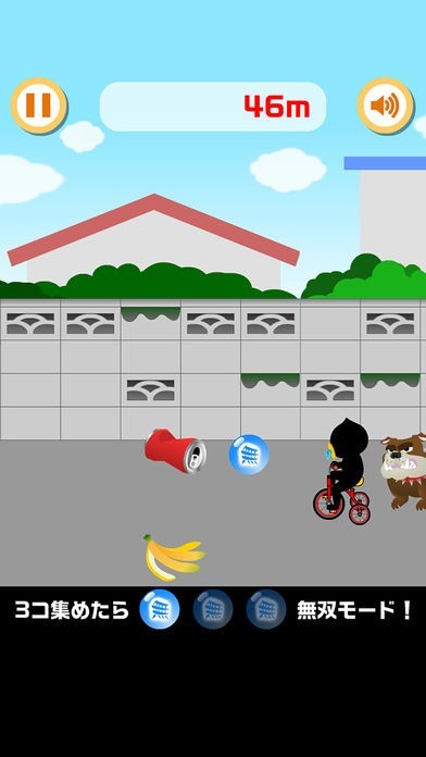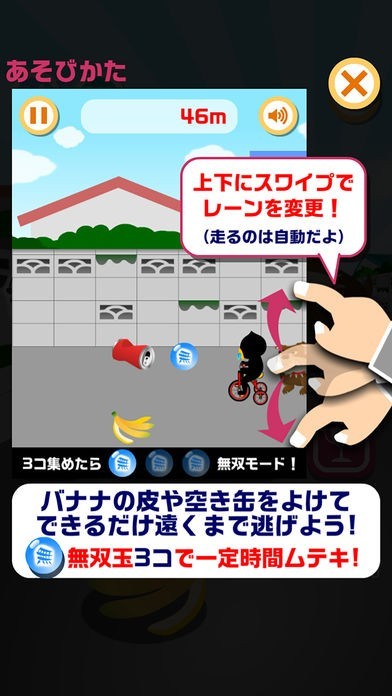 「無双 ! 三輪車」はおしゃぶりをくわえた子供となって三輪車で町内を爆走する横スクロールアクションゲームアプリになります。ゲームの操作方法は画面を上下になぞることで主人公を移動させることができるようになっていて徐々に早くなっていくスピードのなかで、バナナや空き缶など道に転がっている障害物にぶつからないようによけながら進むことができた距離を競うゲームとなっています。途中に落ちている無双玉を三つ集めることで無敵モードに突入して、障害物に当たってもゲームオーバーとならなくなるので、確実に無双玉をあつめることがゲーム攻略のためのポイントになります。
