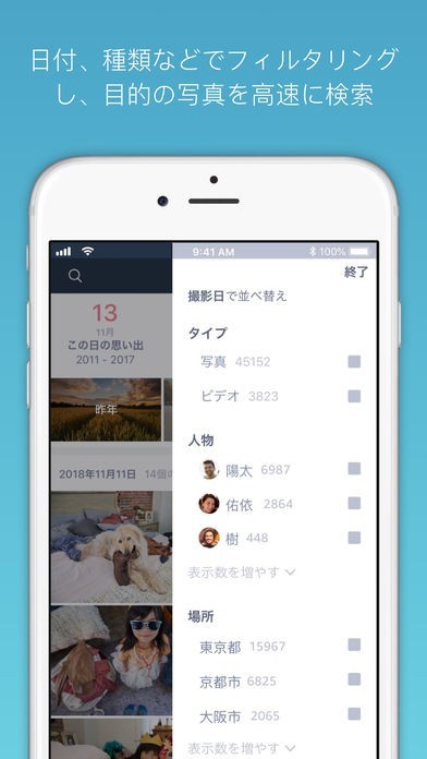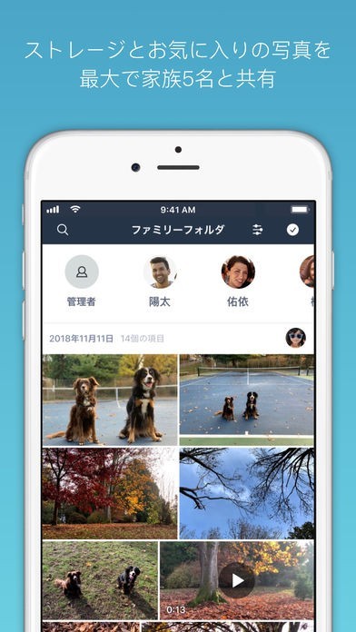 スマホ内の全ての写真とビデオを整理しバックアップできるアプリです。撮影した写真は自動保存されて、バックアップも自動で行われます。保存された写真は全てのデバイスからアクセス可能で、友人や家族との共有も簡単です。タイトルをつけてアルバムを作成できるので整理も楽です。 スマホを紛失したりデータが消えてしまっても、写真とビデオはストレージに安全に保存されているので安心です。写真とビデオでスマホのメモリが圧迫されるのも防げます。