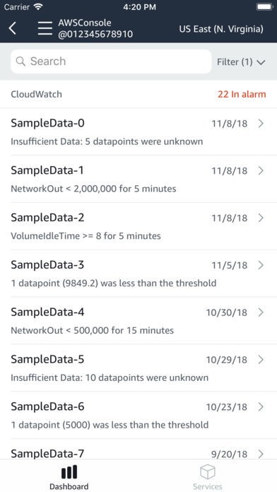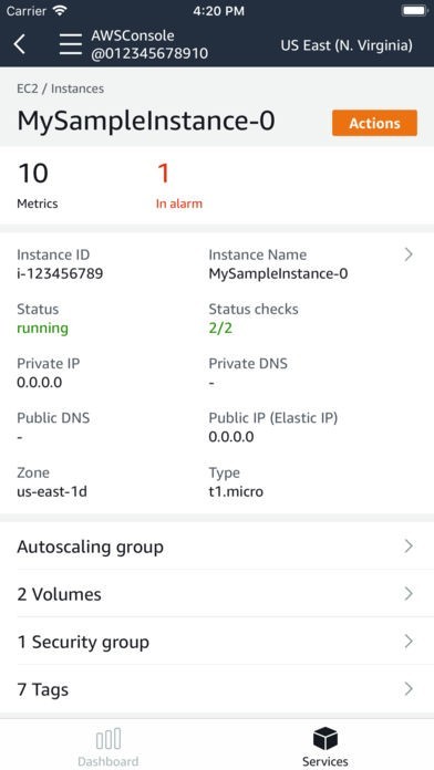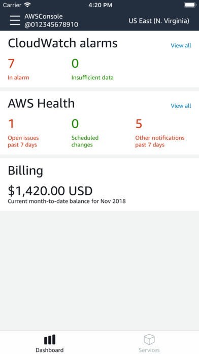 The Console Mobile Application allows AWS customers to monitor resources through a dedicated dashboard and view configuration details, metrics, and alarms for select AWS services. The Dashboard provides permitted users with a single view of a resource's status, with real-time data on Amazon CloudWatch, AWS Personal Health Dashboard, and AWS Billing and Cost Management. Customers can view ongoing issues and follow through to the relevant CloudWatch alarm screen for a detailed view with graphs and configuration options. In addition, customers can check on the status of specific AWS services, view detailed resource screens, and perform select actions.