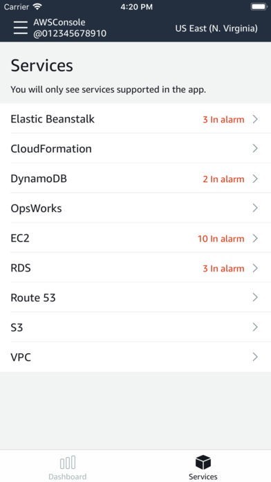 The Console Mobile Application supports AWS Billing and Cost Management, AWS CloudFormation, Amazon CloudWatch, Amazon DynamoDB, AWS Elastic Beanstalk, Amazon Elastic Compute Cloud (Amazon EC2), Elastic Load Balancing, AWS OpsWorks, AWS Personal Health Dashboard, Amazon Relational Database Service (Amazon RDS), Amazon Route 53, Amazon Simple Storage Service (Amazon S3), Amazon Virtual Private Cloud (Amazon VPC).