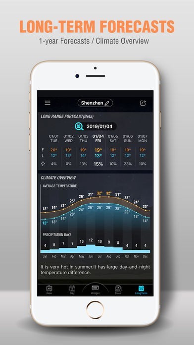 このアプリでは、向こう1年間の気候概要をチェックすることができます。通常の天気予報アプリには搭載されていない機能であり、旅行の予定を立てる際などに役立つ機能です。