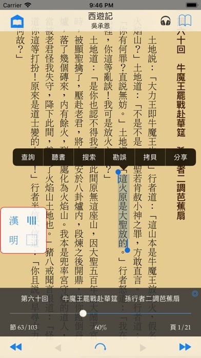 ⑧ 長按文字可以查閱內置詞典、朗讀、拷貝、搜索(UPDB格式另加「勘誤」)