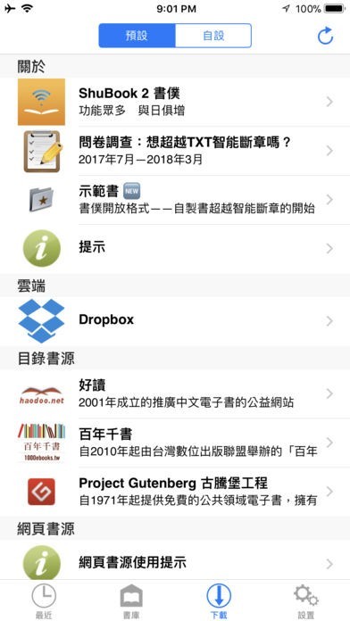 ① 可從內置的多個(OPDS目錄及HTML)書源,包括好讀、Dropbox等,後台下載大量免費圖書;可以自設書源