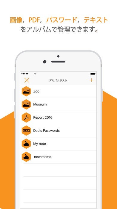 ・データはアルバム単位で保存し、すべてのアルバムがパスワードを持ちます
