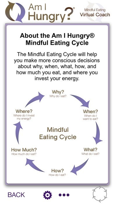 App Storeより引用The Am I Hungry?® Mindful Eating Virtual Coach was designed to help you end futile restrictive dieting and resolve mindless and emotional eating. Designed and developed by founder Michelle May, M.D., this app will guide you through the Am I Hungry? Mindful Eating Cycle. It is a powerful tool for making more mindful decisions so you are in charge of every decision without having to resort to rules and restrictions.
