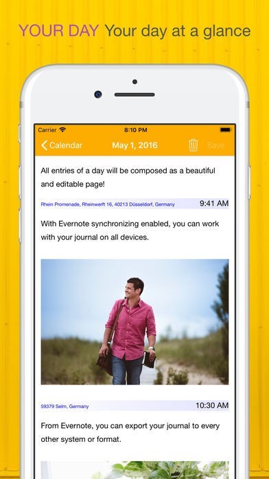 App Storeより引用We designed the YourDay Journaling App with a simple vision: create your journal perfectly in conjunction with Evernote. You should keep every moment, every picture, every day als careless and fast as possible. And it doesn’t matter, if you create your journal or diary directly on your phone or dictate it just form your wrist. The second goal is straight forward: We want that you have protected but easy access of your journal from every device. We achieved it with the most perfect app integration of Evernote, if you will.