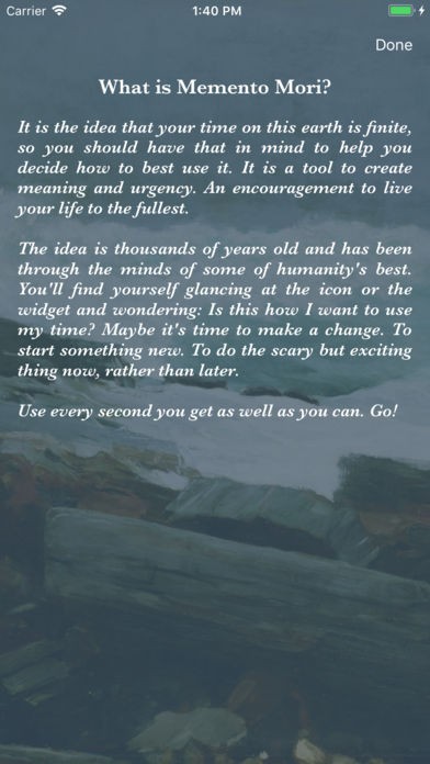 App Storeより引用Memento Mori is an app meant to remind you to focus on the important things. It consists of an app and a widget which show you your exact age and how it is always increasing. Put it on your home screen and let it remind you every once in a while to be more mindful of what you actually want to do.