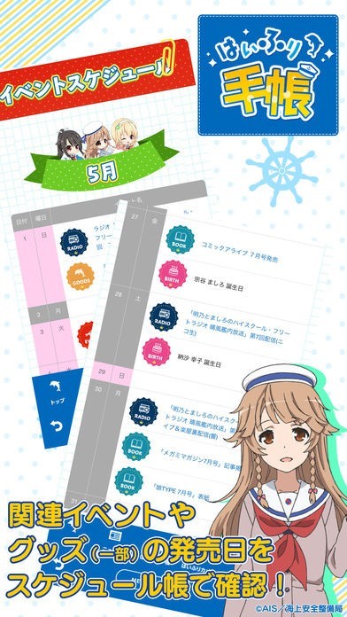 関連イベントやグッズ(一部)の発売日が確認できるスケジュール帳です。