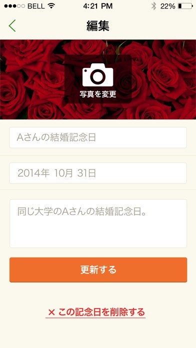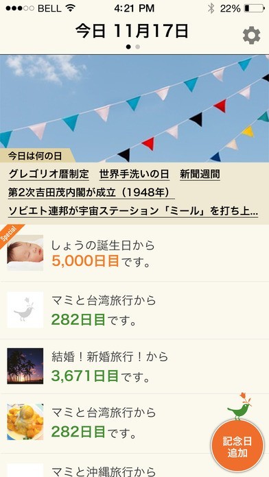 このアプリは記念日からの経過日数が一目でわかる様になります。自分の個人的な記念日でも登録できるので、些細な事であっても、その日はとても大切な記念日だったのだと気づかせてくれます。写真も一緒に保存しておけるので、何日も経過して思い出しづらくなってしまった記念日でも、すぐに思い出す事ができます。自分の目標を定めた日を設定しておけば、その日から何日経過し、その目標はどれぐらい達成できているのかも把握しやすくなります。記念日は自分で作る事ができます。年に1回だけではなく、1日1日を大切な記念日として過ごしてみる事で、気持ちを豊かにしてくれます。