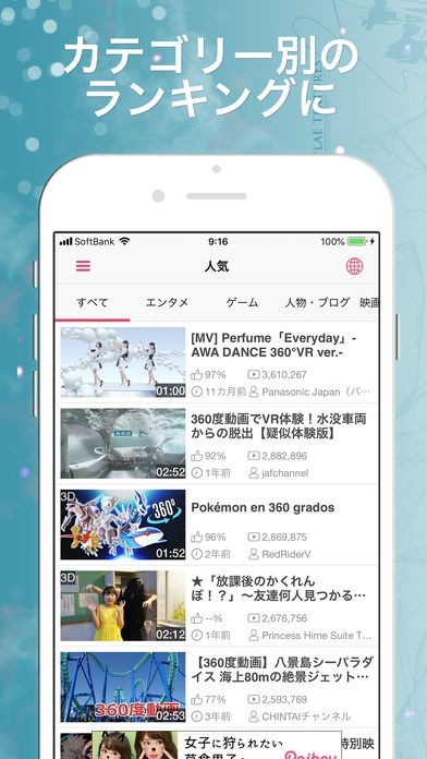 VR Tube for YouTubeの機能を使えばVRに対応している動画が見放題になります。新しい技術に興味があるという方や、わざわざ自分でVRに対応している動画を見つけるのが煩わしいという方に最適な機能です。ランキング形式に対応しているので、みんなから評価されている動画を効率的に見つけることができます。iPhoneのジャイロセンサー機能に対応しているので、VR動画を視聴している時にはiPhoneを上下左右に動かすことで視点変更に対応しています。気になるVR動画が見つかったらプレイリスト機能の出番です。いつでも好きな時にワンタッチで視聴できるようになります。