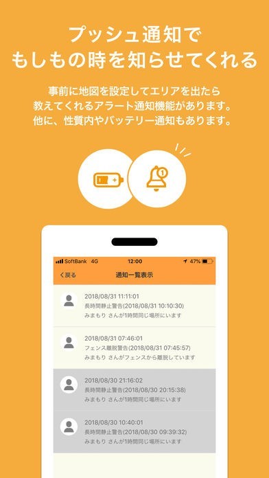 タップするだけの簡単操作で地図上の通知エリアを設定できるので、年配の方でも安心して使えます。目を離すとどこかに行ってしまう小さな子供から、一人での外出が不安なお年寄りの見守りにも便利です。