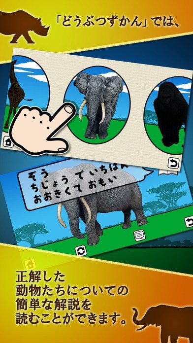 2~3歳のお子様が対象の知育・教育アプリです。3歳までの幼児期に脳の80%が作られるという研究結果もあり、2~3歳は特に感覚が発達しやすい時期。成長しているお子様と楽しくアプリで学習してみてはいかがでしょうか。遊び方は簡単。画面に出てくる動くシルエットの中で対象の動物を選び、タップするだけ。正解すると対象の動物をゲットできます。お子様と一緒にすべての動物をコンプリートしましょう。動物の姿形だけではなく、その動物の仕草や鳴き声も学習できます。