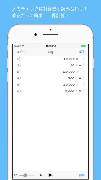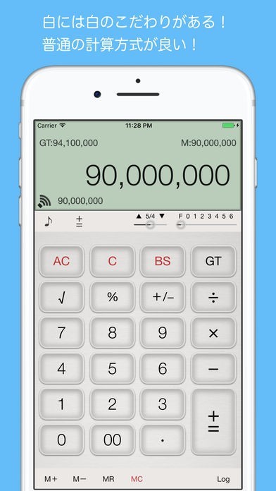 App Storeより引用(500×10)+(300×25)-(300×5) などの会計計算に便利な計算機(加算式/算式 ワンタッチで変更可)に便利な「ログ編集・再計算+読上げ機能」が付きました。 プラスあなたの愛機にピッタリのデザインを驚くほど簡単にカスタマイズする楽しさも味わって下さい。リアルな電卓のイメージも再現した実務に耐える本物の計算機です。 今はなかなか手に入り難くなった加算器方式の計算機をいつも持ち歩くiPhoneとiPadにいかかですか。