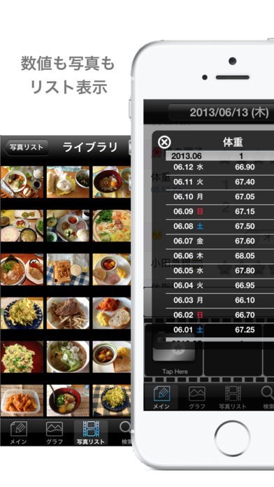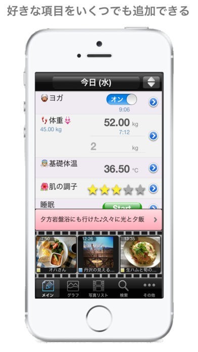 体脂肪、睡眠時間、一日の出費、腹筋回数など、多種多様なデータを一カ所で管理することが出来ます。また、数値はグラフ化されるので、推移が見やすいのも特徴となっています。