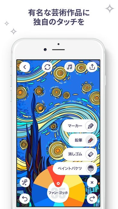 写真や芸術作品、自分が持っている画像の塗り絵など様々な塗り絵を楽しめる