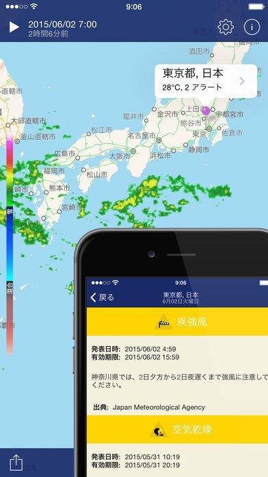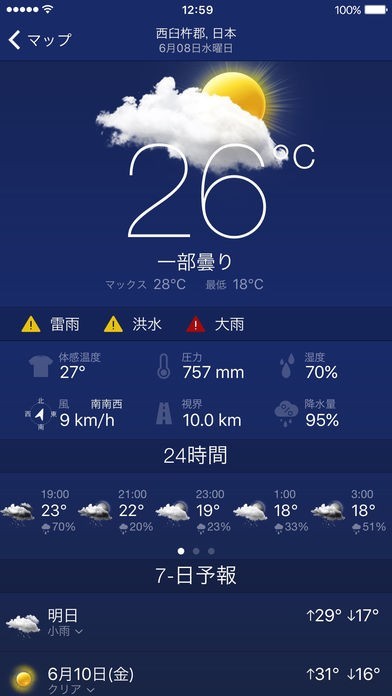 豪雪や竜巻注意報など、警報が発令された時にはプッシュ通知で機能で教えてもらうことができます。降雨・降雪マップもあるので、今後24時間の雨量などがよく分かる仕組みになっています。