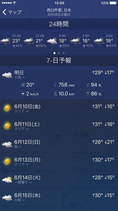 今日の天気はもちろん、降雨確率や体感温度まで細かく分かります。日の出・日の入り時間も分かり、今後1週間の週間天気予報も入っているので、天気を知りたい時にはぴったりです。