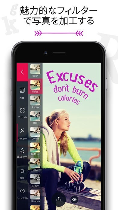 写真などを編集するときに編集できるバリエーションがたくさんあるほどオリジナリティの高いものができます。このアプリでは多くのフォントやアートワークを備えており、個性を出した写真に加工することができます。